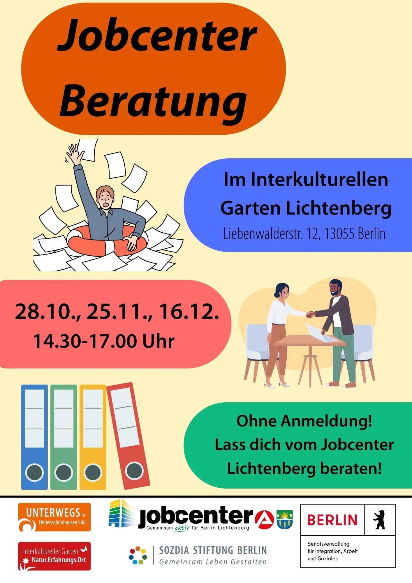 Zwei Mitarbeitende des Jobcenter Lichtenberg beraten Dich zu all Deinen Fragen!