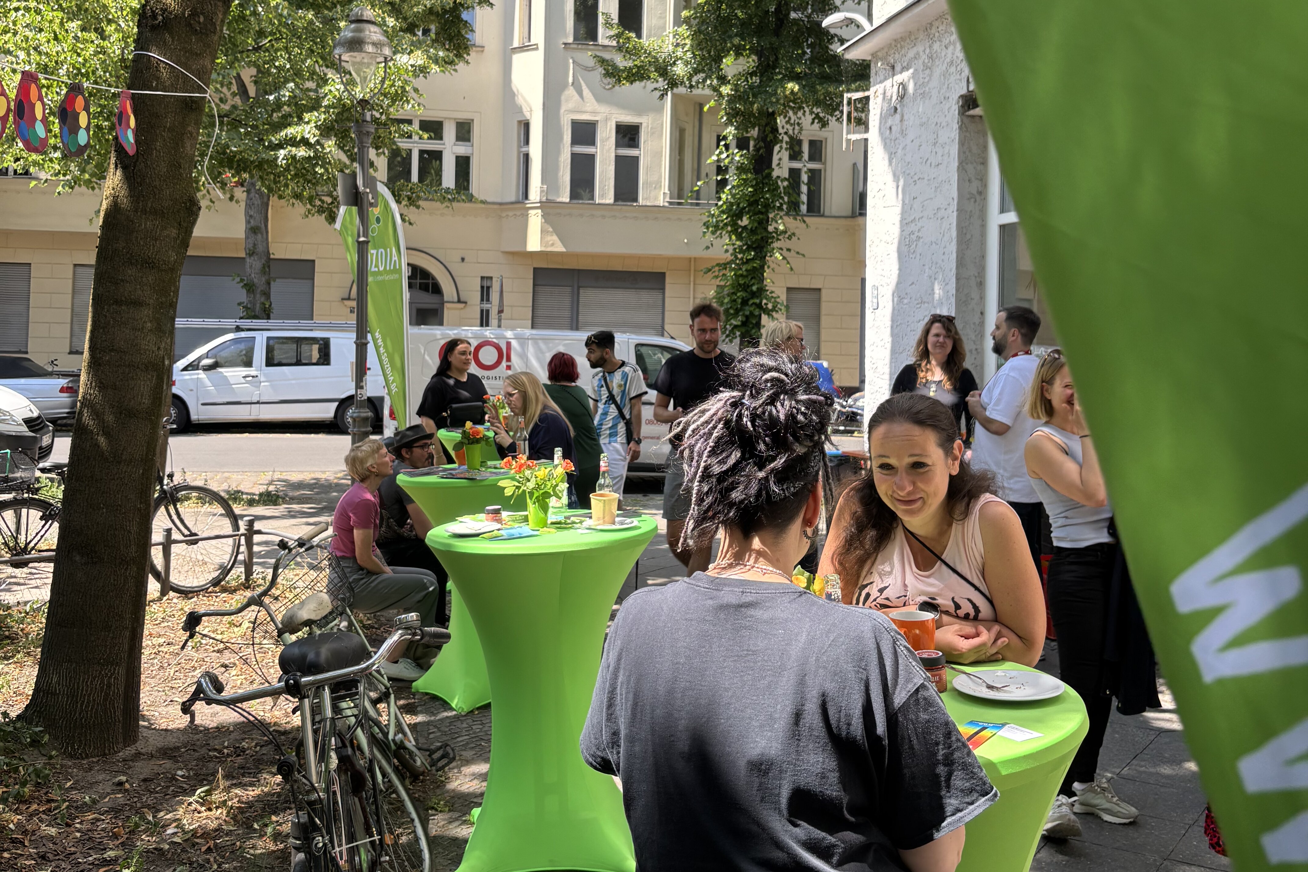 Wie Khaled ist auch Melissa ehemalige Klientin der Wohnungsnotfallhilfe und bei dem Fest in Neukölln dabei. Sie lebt mittlerweile in einer eigenen Wohnung und absolviert eine Ausbildung. Solche Erfolgsgeschichten sind für die Kolleg*innen natürlich eine besondere Motivation. Entsprechend groß war die Freude auf beiden Seiten, sich wiederzusehen. Beim Zusammenstehen guckt Khaled sich um, lächelt und sagt dann mit fester Stimme: „Sie können schreiben, die Leute sind perfekt.“ Sehr gerne.