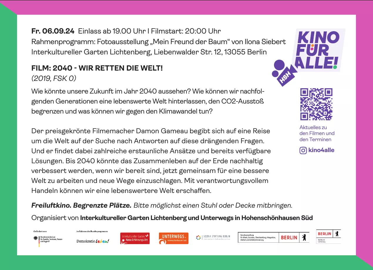 ☀️ Freiluftkino. Begrenzte Plätze. Bitte möglichst einen Stuhl oder Decke mitbringen.