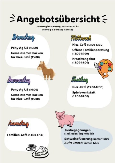 Herzlich willkommen zum Kiez-Café, das ihr mittwochs, freitags und samstags ab 13:00 Uhr besuchen könnt. Entdeckt und genießt die Vielfalt des Platzes im Grünen, die Spielmöglichkeiten für Kinder, trefft andere Familien, lernt die Tiere kennen und genießt das kleine aber feine gastronomische Angebot in dieser Zeit.
