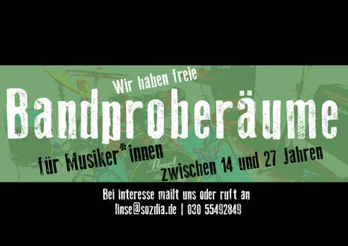 Wenn ihr also noch einen Raum zum Proben sucht und zwischen 14 und 27 Jahre alt seid, schreibt uns gern eine Mail an linse(at)sozdia.de. Für euch werden Schlagzeug und Backline, also Gitarren- und Bassverstärker im Raum vom LibeRo e.V. zur Verfügung gestellt.
