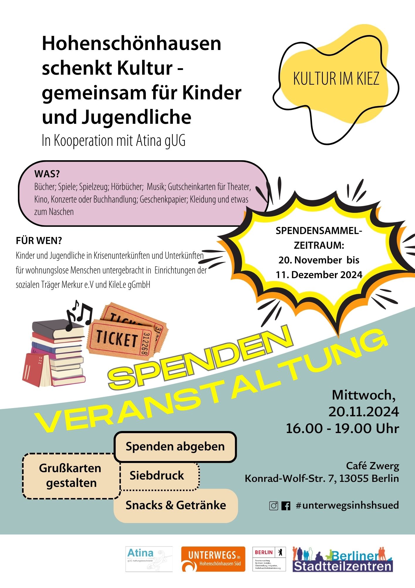 Im November werden wir zusammen mit Atina gUG eine Spendenaktion starten. In Hohenschönhausen gibt es Kinder und Jugendliche, die zu Weihnachten nicht beschenkt werden (können). Um dazu beizutragen , dass der Zugang zu Kunst, Kultur und kultureller Bildung auch unabhängig von der wirtschaftlichen und sozialen Situation ermöglicht wird sammeln wir in der Vorweihnachtszeit „kulturelle Spenden“ wie z.B. Bücher, Hörspiele, Spiele, Gutscheine für Theater oder Kino oder ähnliches. Dabei unterstützen uns viele Einrichtungen aus Alt-Hohenschönhausen und nehmen Spenden an.